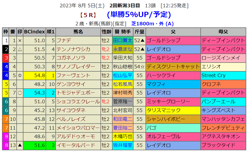 新潟の5R新馬戦は芝の1800mです。指数1位はハーツクライ産駒のファーヴェントです。ハーツクライ産駒も残る世代が限られてきました。母父にディープインパクトが3頭いるメンツでその馬も指数上位です。