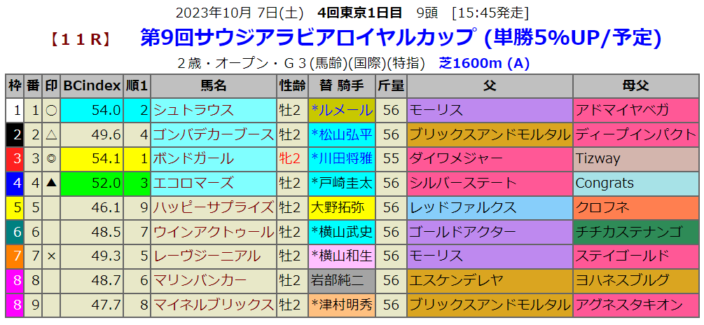今週から開催が変わります。東京と京都の2場開催ですが、京都はまだデータが揃ってないのでBC-indexは東京だけとなります。