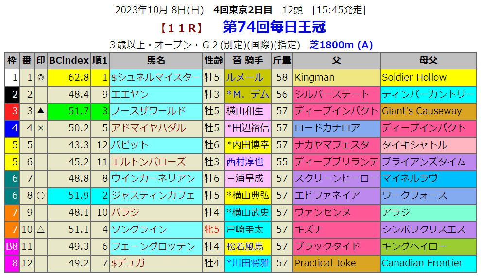 毎日王冠の指数1位は1枠1番のシュネルマイスターです。東京では圧倒的な好成績で一昨年のこのレースの勝ち馬です。さらに近親にはサリオスがいるという血統です。サリオスはこのレース2勝してますからこの馬もそれに倣って欲しいところです。