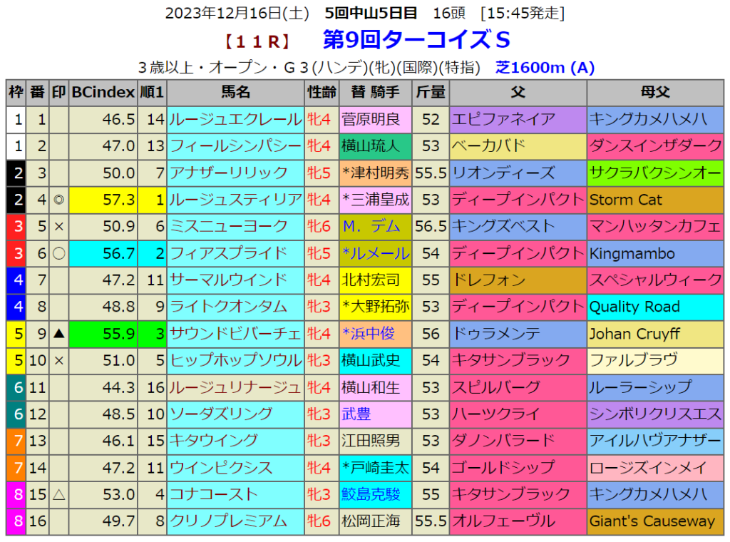 指数1位はまだどうしてもこの血統になります。ディープインパクト✕Storm Catですがこの配合の馬も残り少なくなってきました。距離をマイルに戻して狙いごろという気もします。デビュー戦ではあのスターズオンアースに勝利している馬です。重賞一つぐらいは勝てるはずです。