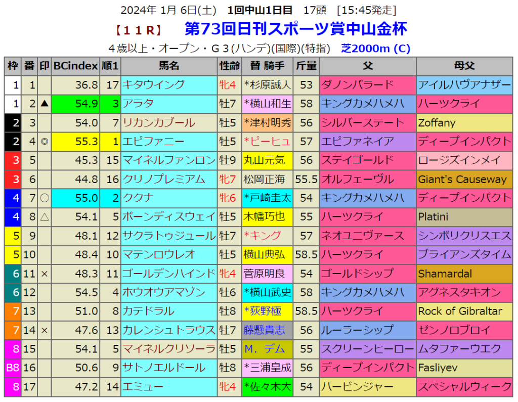 中山と京都開催ですが、まだ京都競馬場のBC-indexはありません。おそらく3回開催あたりから対応できるコースが徐々に出てきそうです。