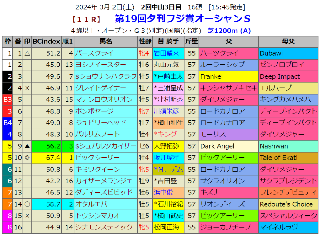 指数1位はビッグシーザーです。サクラバクシンオーの血を引くビッグアーサーの産駒です。この距離ではこの産駒は重賞で勝ちまくるとみています。