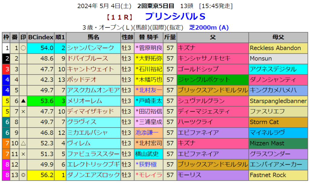 指数1位は大外のダノンエアズロックです。前走の弥生賞で2番人気に押された馬です。その時も指数は1位でした。兄に東京新聞杯など重賞を3勝しているプリモシーンがいる血統です。東京競馬場では既に2勝し鞍上もモレイラですから、ほぼ鉄板です。血統面で気になるのは内枠1番のシャンパンマークです。NHKマイルCを昨年勝ったシャンパンカラーです。そして父はこの日行われる京都新聞杯の2013年の勝ち馬キズナです。この週は血が騒ぎそうです。