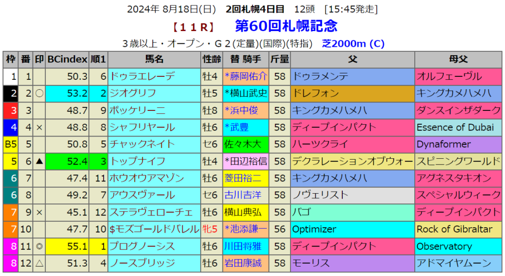 札幌記念の血統指数予想