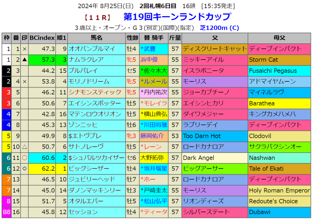 指数1位はビッグシーザーです。この距離の重賞等で指数1位が5回連続です。この指数1位ではまだ勝っていません。そろそろ勝利してもらいたいところです。ちなみに01オオバンブルマイは16年のこのレースを勝ったブランボヌールの甥にあたる血統です。キーンランドC勝ち馬の血が騒ぎます。また02ナムラクレアは昨年の覇者ですから、連覇が懸ります。
