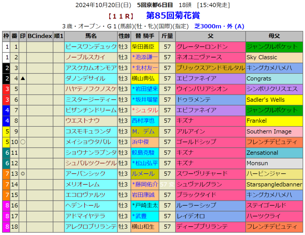 菊花賞の血統指数予想