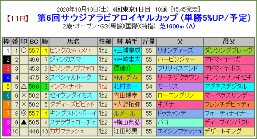 秋競馬は舞台が変わります。そしてスタンドにはお観客さんが入るようです。少しずつですが競馬が戻ってくれてるようです。明日は2歳重賞サウジアラビアRCがあります。今年で6回目を迎えますが、過去の勝馬を見ると出世レースです。