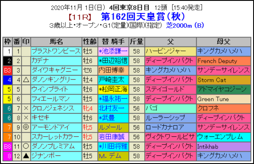 BC-index1位はアーモンドアイです。実はアーモンドアイが指数1位になったのはこれまで2回しかありません。その2回とも勝っているのですが、今回はどうでしょうか。2番人気のクロノジェネシスは血統的には評価が下がります。相手候補は外枠の2頭のディープインパクト産駒です。今日は人気の薄いディープインパクト産駒が勝利しています。この流れでの好走に期待です。