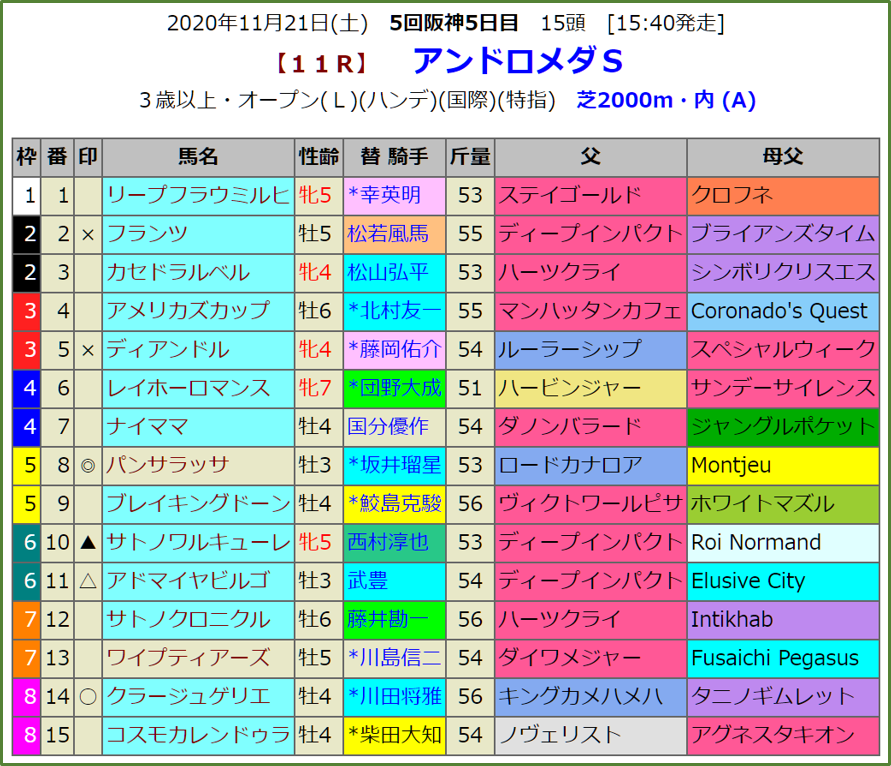 リステッド競争のアンドロメダSの血統指数予想です。指数1位は三歳馬パンサラッサです。前走は東京の2000Mで好走しました。府中で逃げて2着ですから、阪神ならもっと向きそうな気もします。