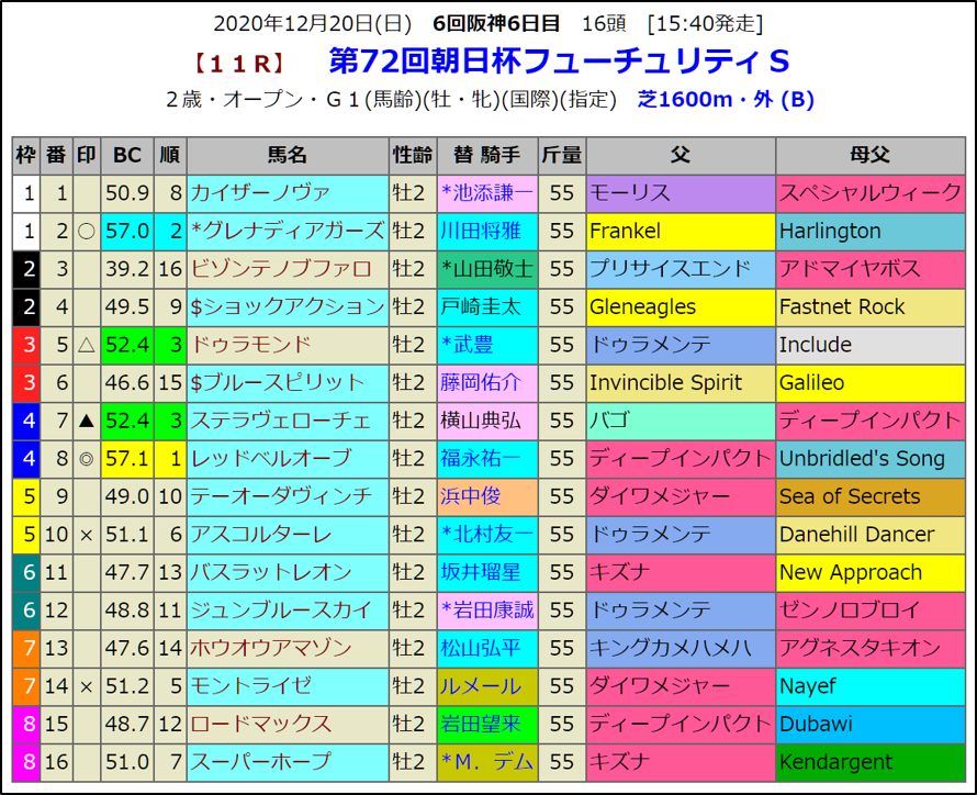指数1位はレッドベルオーブです。阪神で行われるようになって今年で7回目ですが過去3回はディープインパクト産駒が勝利しています。今年は産駒の出走は2頭ですが、母父ディープインパクトという馬も出走です。またこの馬はJRA-VANのPOG指名馬ですから勝ってくれれば来年のクラシックが大いに楽しめます。