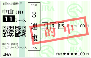 <馬券> 一頭軸流し 9-1,7,8,13,15