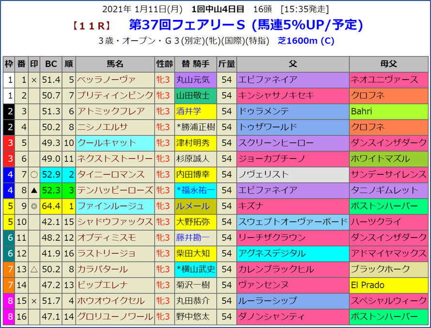 芝のマイル重賞なのにディープ産駒の出走がありません。ディープの仔であるキズナ産駒が指数1位となりました。ディープインパクトの後継種牡馬として活躍が目立ちます。3歳世代が2世代目ですがまだこの世代では重賞勝ちがありません。このレースで期待です。指数1位はファインルージュです。ちょうどいい感じでノーザンFの生産馬が1位となりました。サンデーサイレンスの3×4の配合を持っています。1頭を除いてはみな1勝馬なので、重賞といったイメージが今一つですが素直に血統面からの馬券で勝負です。