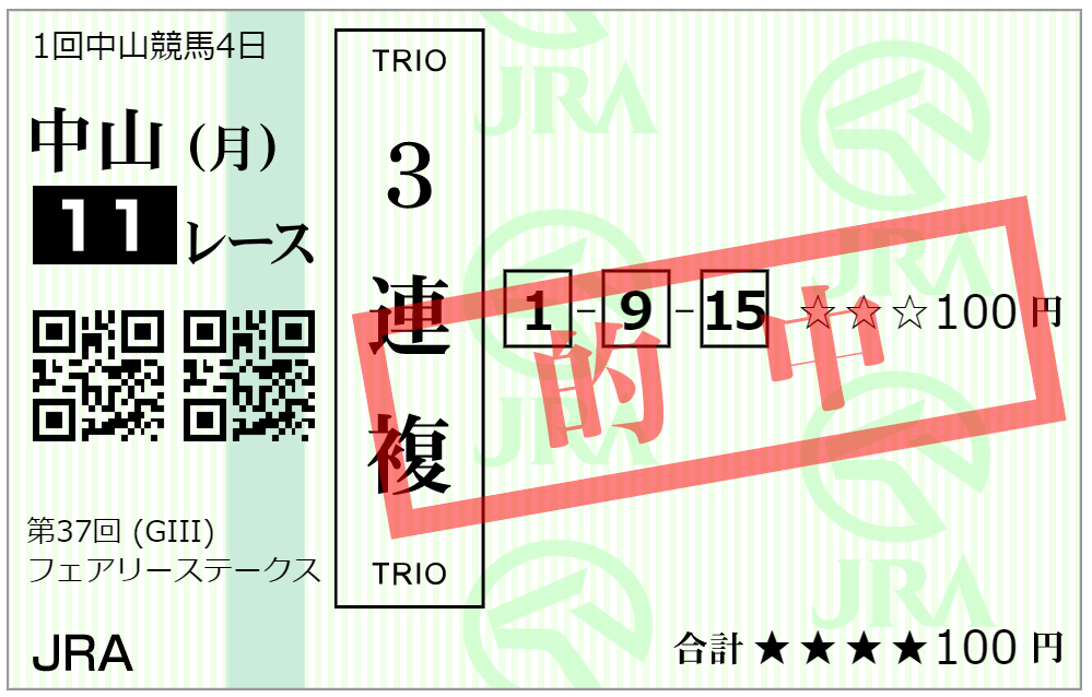フェアリーSでは教訓を活かして印を廻しましたが、結果は指数1位→4位→5位で3連複はなんとか的中できました。配当は3連複で24,370円、3連単だったら120,220円の配当でした。ともに勝利騎手はルメールでしたが、1番人気ではない馬での勝利は美味しい馬券になりました。