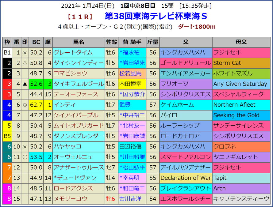 指数1位馬はインティです。前走のチャンピオンズCでは10番人気ながらも3着に好走し復活を印象づけました。その時も指数は1位だったのですが、一昨年のこのレースを勝っていますから中京に戻ったのは好条件かもしれません。7歳になりますが、過去7歳馬が勝ったのは2頭ほどいます。