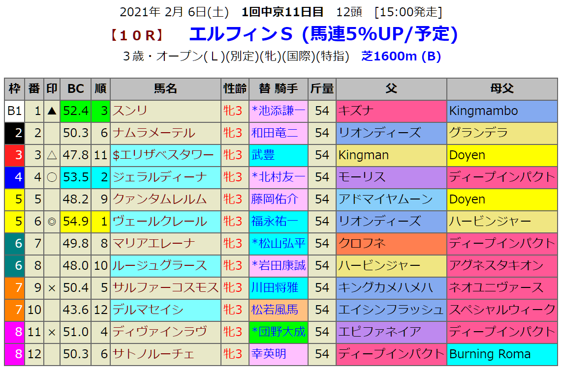 指数1位はヴェールクレールです。血統的には母系にウインドインハーヘア、あのディープインパクトの母がいます。ここ2戦は勝ち切れない競馬が続いていますが前走福永騎手のコメントは「厩舎スタッフがいい仕事をしてくれました。返し馬からも課題が修正されていたことが分かりました。レースも終いに良く伸びています。この走りができるなら距離が延びても大丈夫だと思います」です。今回の距離は期待が持てそうです。
