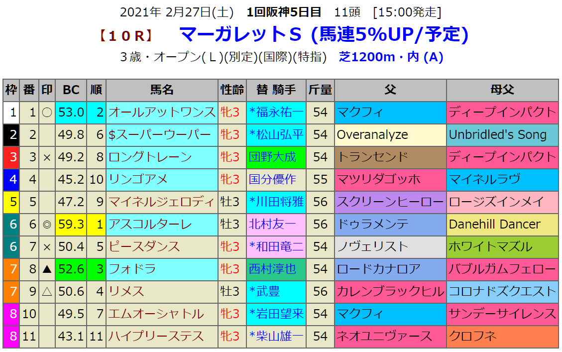 指数1位はドゥラメンテ産駒のアルコルターレです。この産駒は芝1400mの成績がいいのですが、母父ディープインパクトも気になります。馬連5%Upのレースですからしっかり馬連的中を狙いたいところです。