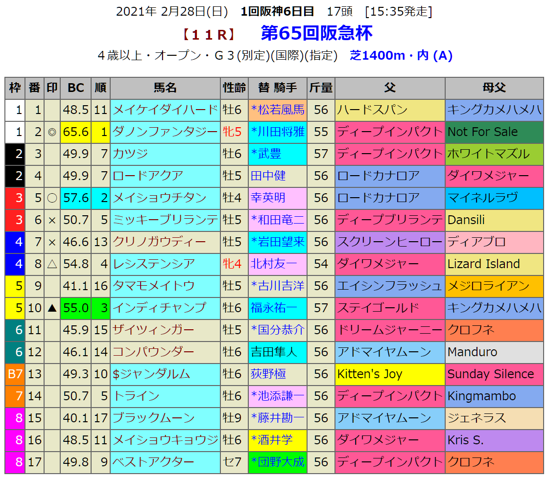 指数1位は牝馬ダノンファンタジーです。阪神コースの適性が高い馬です。前走の阪神Cではこの距離の適性が示された感があります。