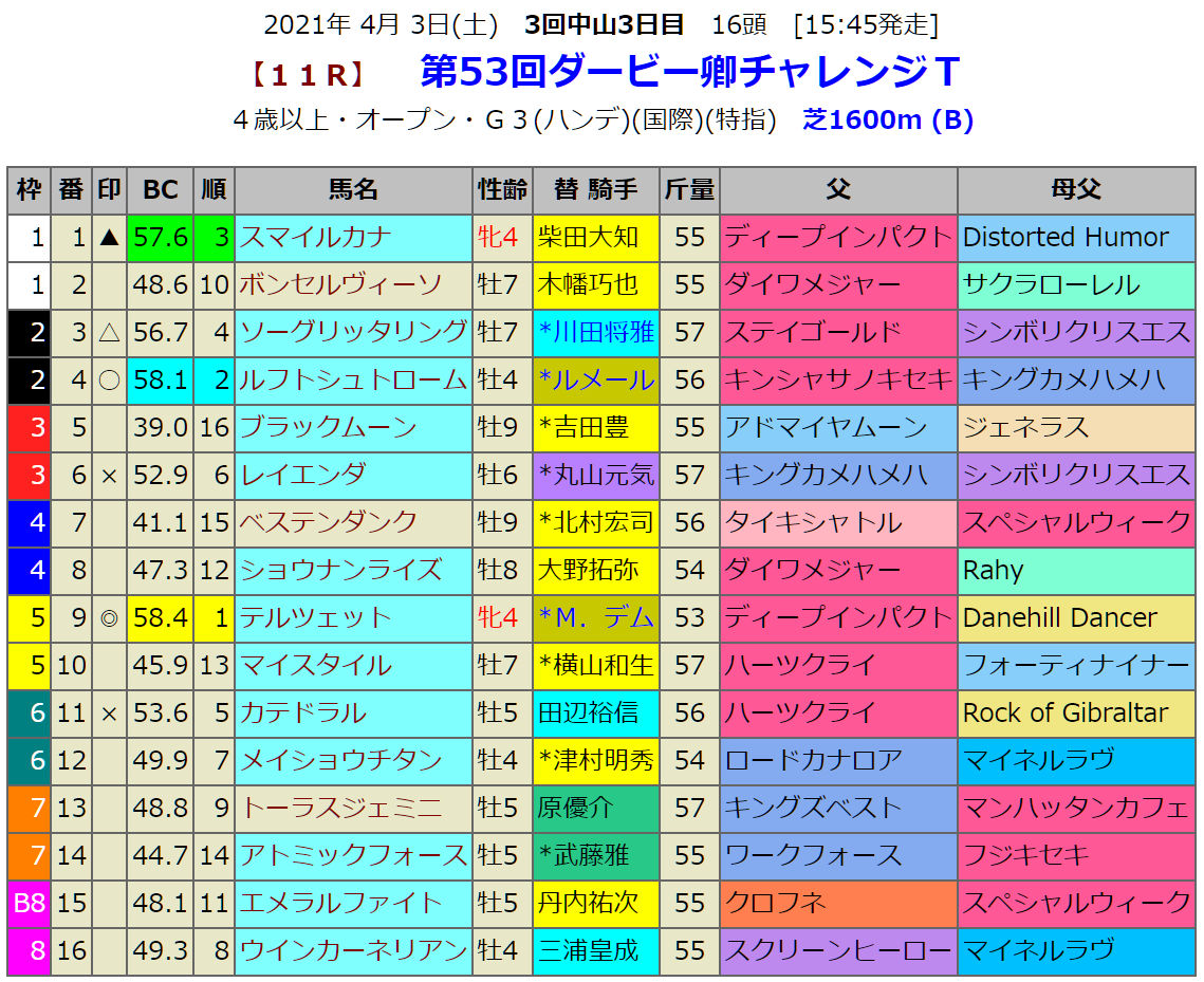 指数1位は牝馬テルツェットです。現在マイル3連勝中で初重賞挑戦です。53kならこの勢いで行ってほしいところです。デビュー戦は中山ですから、右回りや坂の心配もいらなさそうです。相手はルフトシュトロームです。前走大敗してますがデビューから中山のマイル3連勝した馬です。巻き返しがありそうです。